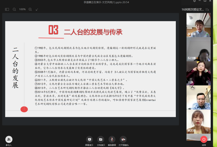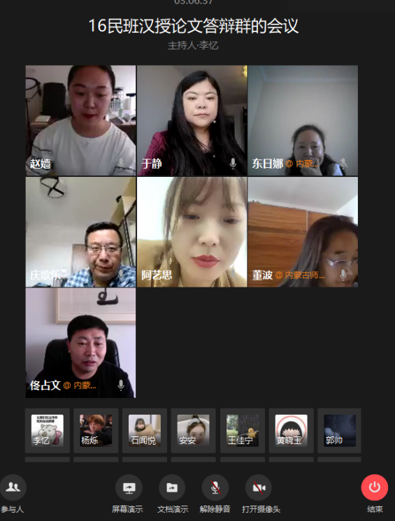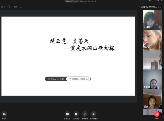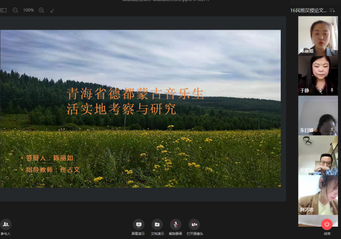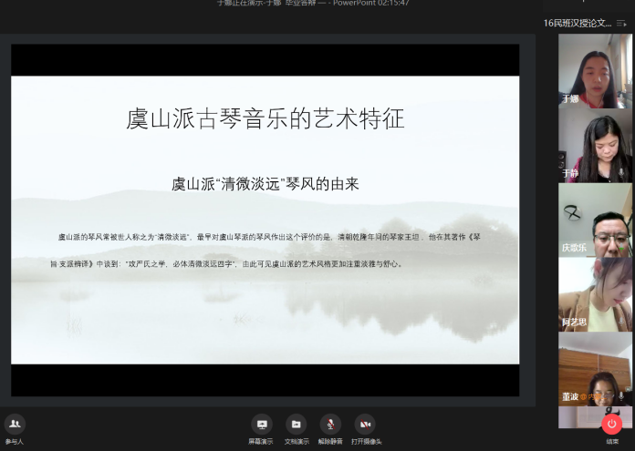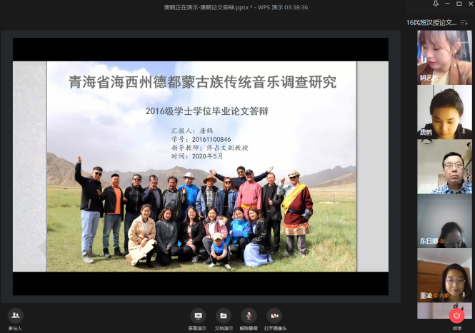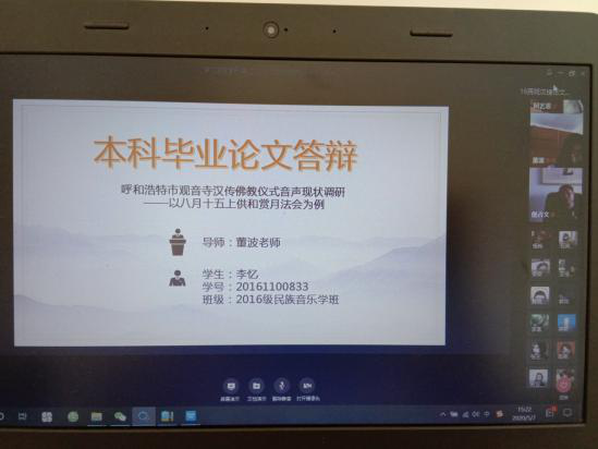 为了保障疫情防控时期师生安全、同时保证本科生正常毕业,公司领导高度重视毕业生工作,公司为2020届毕业生制定了线上答辩工作方案,决定用线上视频的形式完成今年毕业生的毕业论文答辩,力求为毕业生上好“最后一课”。2020年5月7日下午2:30,音乐学(民族音乐学方向)开展了2020届本科毕业论文在线答辩,开启3044永利首场本科毕业生论文答辩。