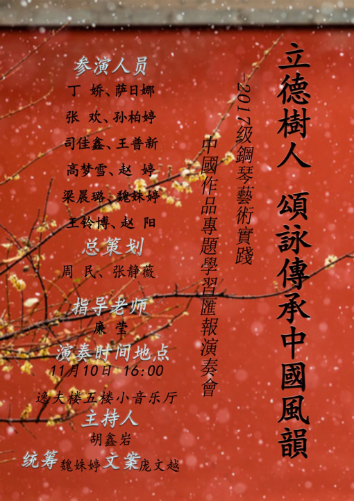 艺术实践课是钢琴系集体必修课,以同一年级钢琴主修专业员工的集体课教学组织形式进行,是将实践性教学、互动式教学、反思式教学融为一体的综合性实践课程,是钢琴系专业课实践教学中的重要环节。课程思政理念为该门课程注入了更多的德育美育元素、传统文化元素、红色政治元素,在备课教学大纲、教学方案时,将主题学习和思政教育的价值观内容加入到课程设计之中,实现恰到好处、自然而然的融合。本学期该门课程遵循并融入了“课程思政”的理念,2017级艺术实践课以中国经典钢琴音乐作品为学习主题,在教学过程中于细节处,积极渗透,主旨弘扬中华优秀传统文化及红色革命精神,学习老一辈作曲家热爱祖国山川、热爱家乡人民,拥护党的领导,讴歌军民一家亲、赞美劳动人民、憧憬祖国美好未来等等的真挚情感,以及他们在峥嵘岁月中不屈的创作精神,学习成果以此次学习汇报演奏会的形式进行展示。