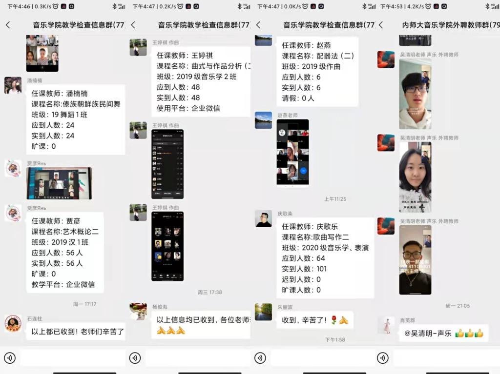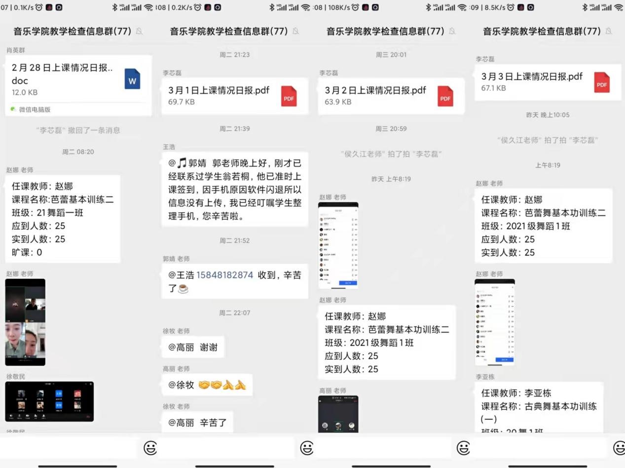 公司加强本科课程在线教学质量监控,成立公司督导组对每天上课情况进行督导。理论课及舞蹈课任课教师在每个上课节点通过“公司教学检查信息群”准时附上点名截图考勤打卡,并设有专职人员每天进行统计;专业技巧课任课教师将每堂课截图发送系主任,系主任发送给当天督导组进行督导。精准把握在线学情,公司本科生在线学习出勤率高。