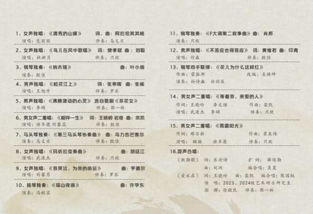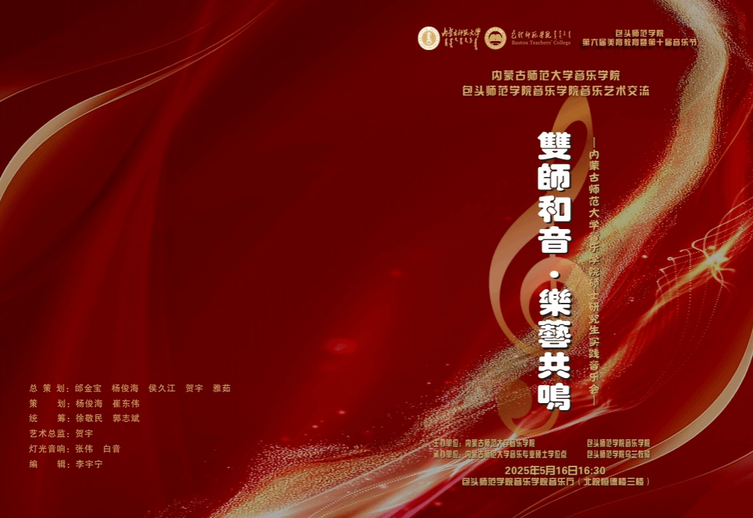 为促进校际艺术教育合作,推动音乐学科协同发展,3044永利与包头师范公司3044永利定于2025年5月16日(星期五)16:30,在包头师范公司3044永利恒德楼三楼音乐厅联合举办"双师和音·乐艺共鸣——3044永利硕士研究生实践音乐会"。