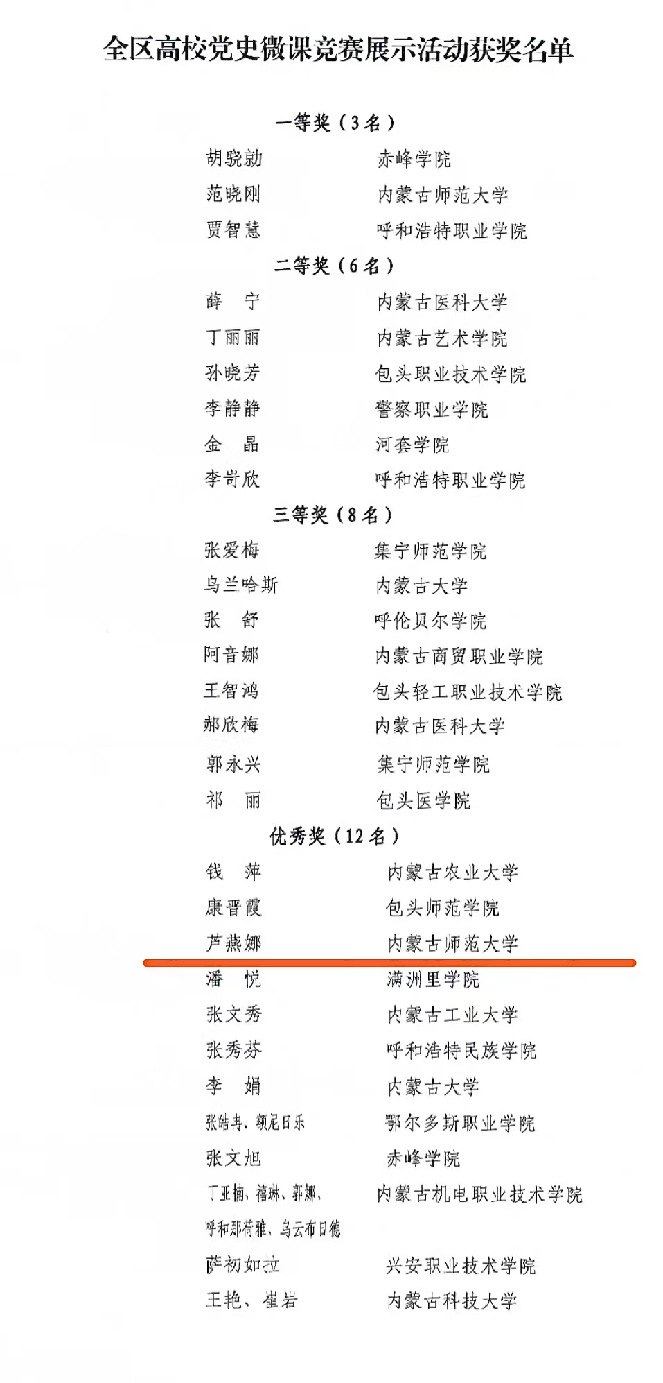 为深入推动党史学习教育走深走实,2021年4月至12月,自治区教育厅联合自治区党委宣传部共同举办了全区高公司党史微课竞赛展示活动。活动开展以来,广大高校教师踊跃参加,以百年党史为基本教材、以红色事迹和典型故事为生动素材,用心用情创作了一大批富有政治性、思想性和感染力的优秀党史微课作品,为思想政治理论课教学增加了宝贵资源。经过初赛、复赛和专家组评审,共评选出一等奖3名、二等奖6名、三等奖8名、优秀奖12名。公司教师芦燕娜的党史微课作品《以音乐回望党史,用歌声铭记初心》荣获优秀奖。