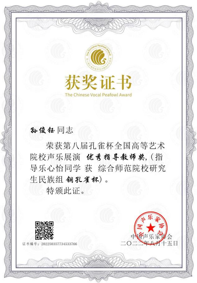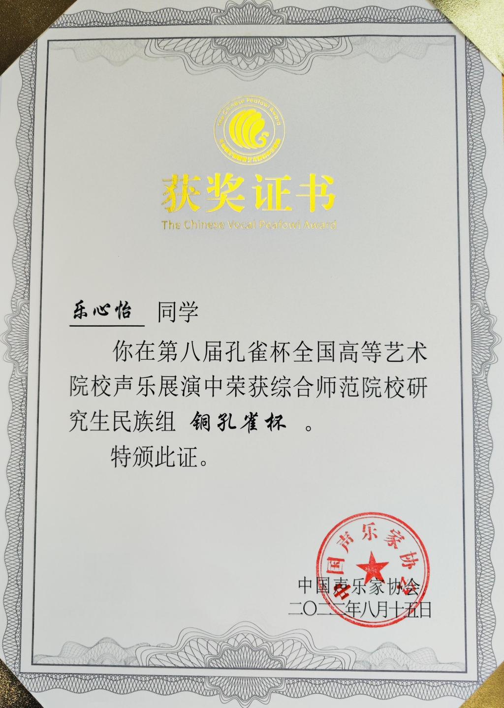 2021级艺术硕士生乐心怡同学获综合师范院校研究生民族组“铜孔雀奖”;