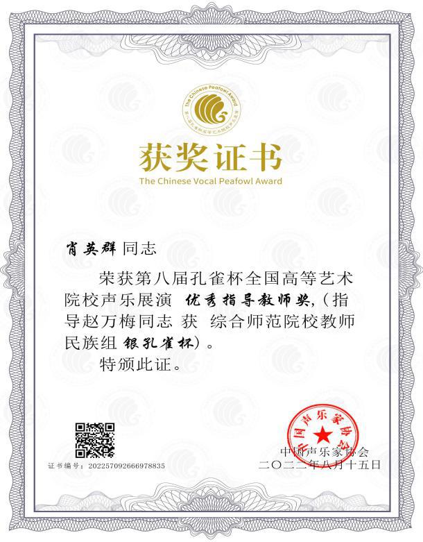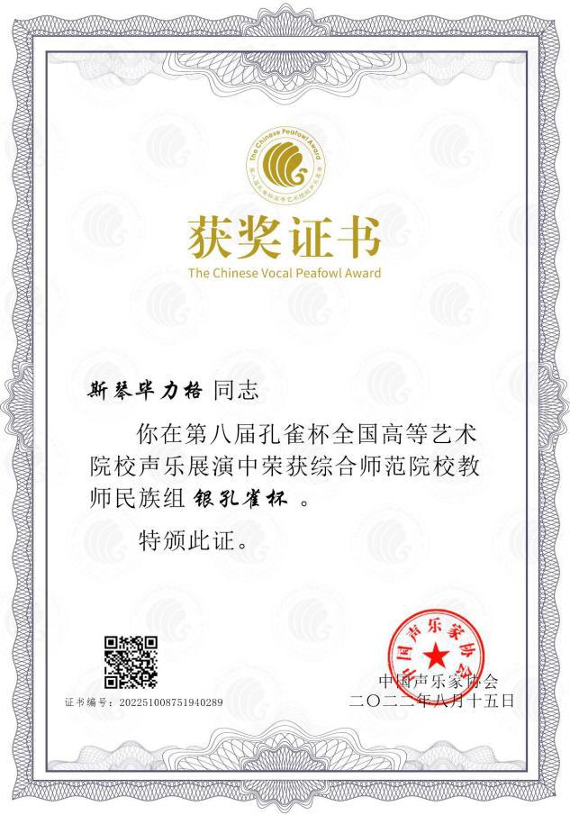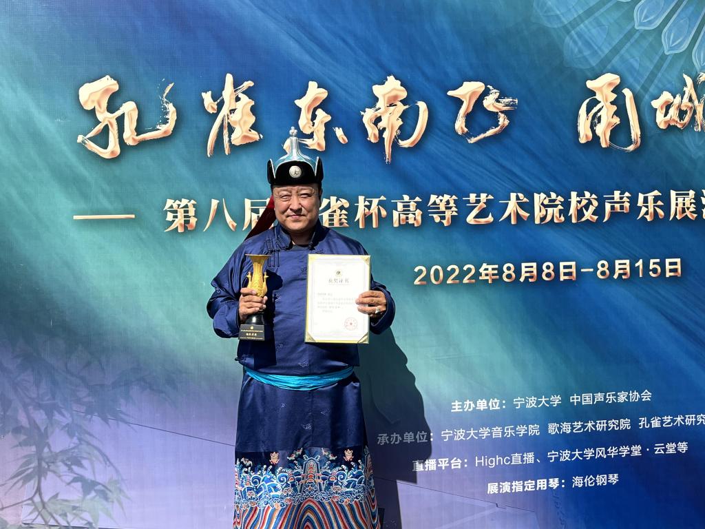 3044永利声乐系共有13位师生参加了本次展演。获得了8个奖项。其中公司教师斯琴毕力格获得综合师范院校教师民族组“银孔雀奖”;