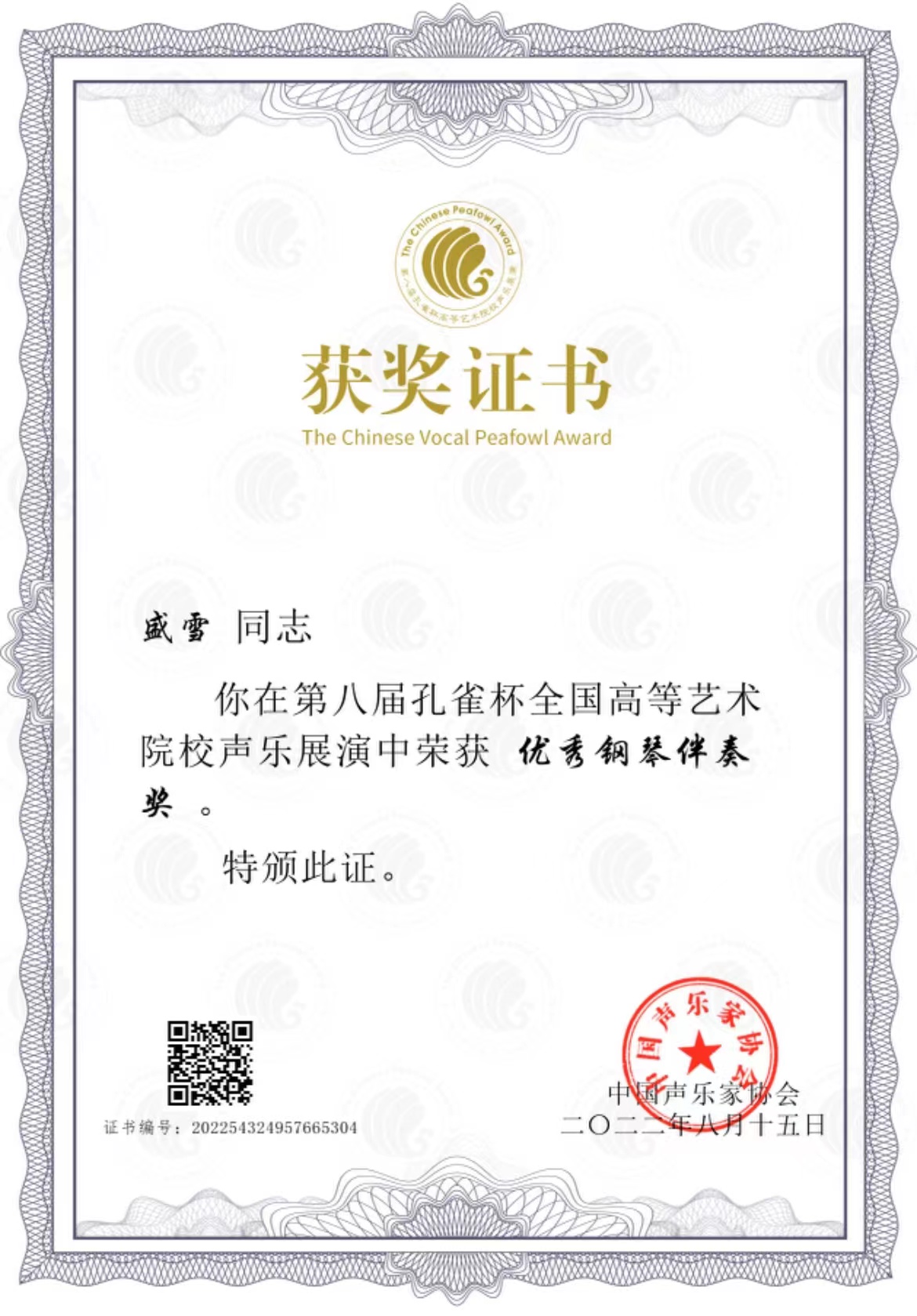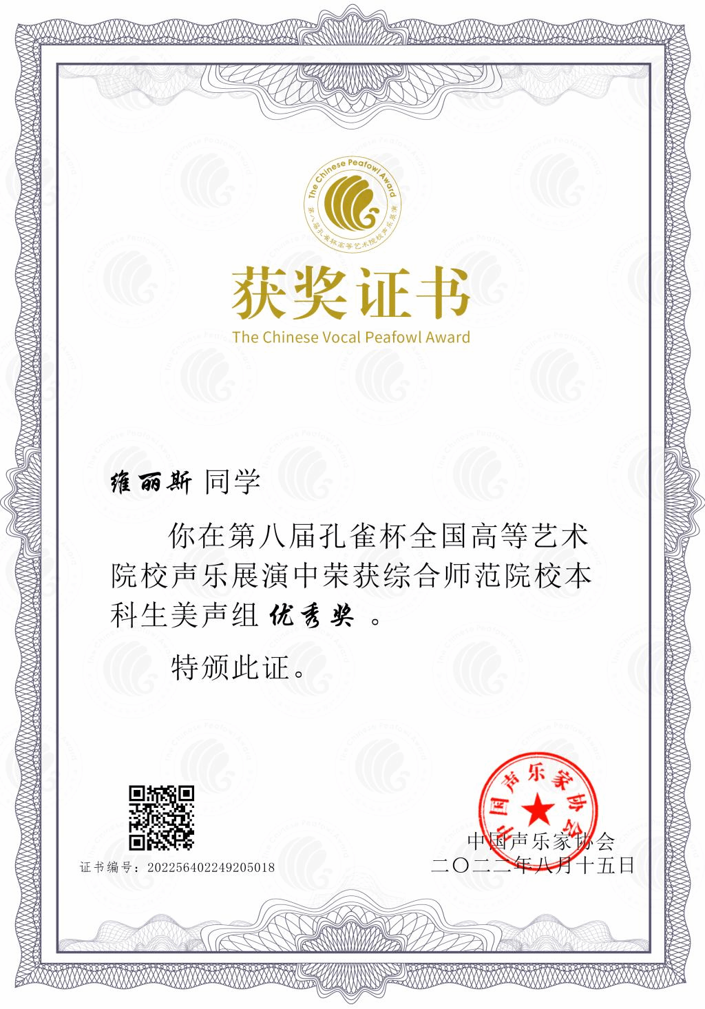 2020级音乐表演班维丽斯同学获综合师范院校本科生美声组“优秀奖”。