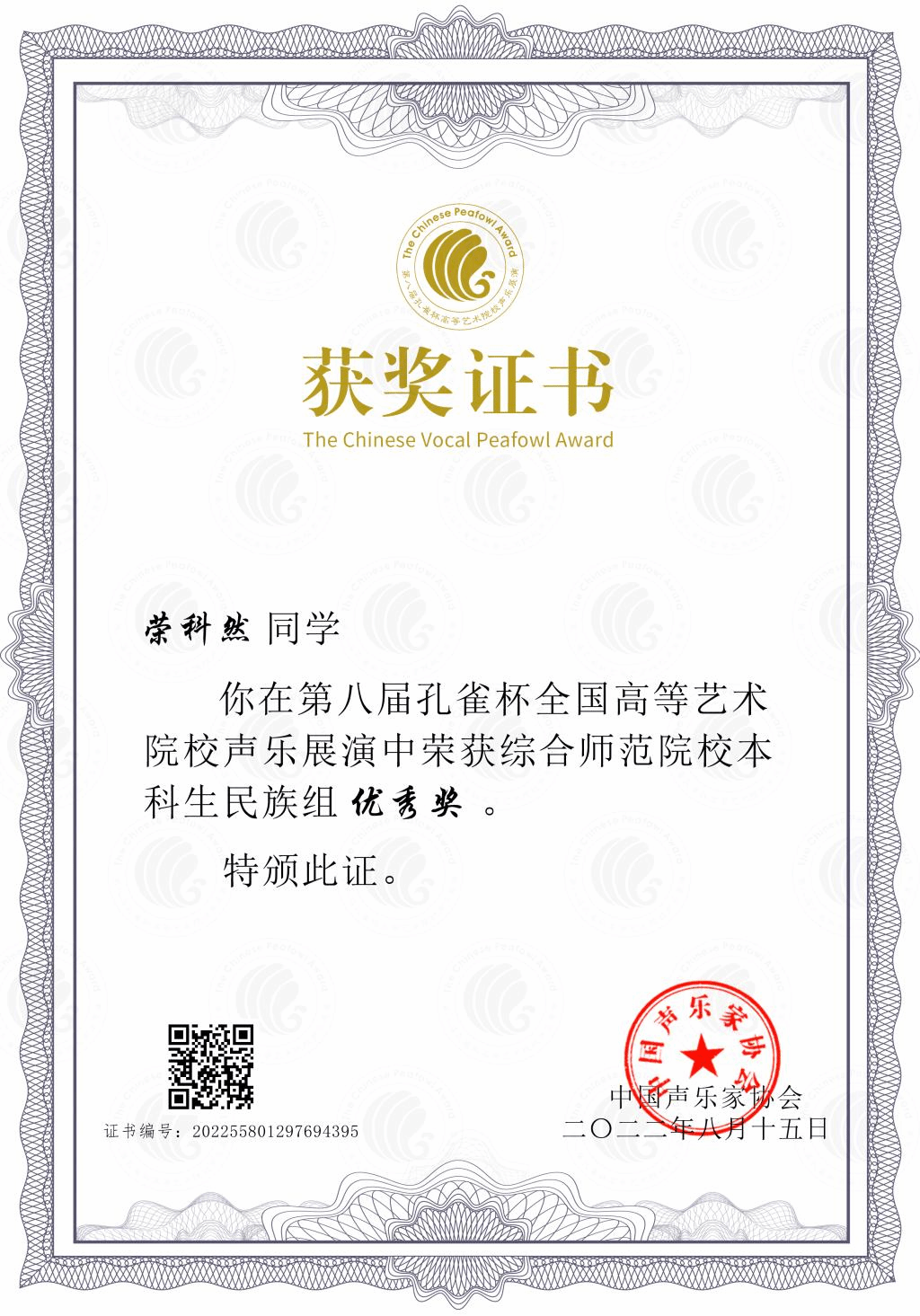 2020级音乐学班荣科然同学获综合师范院校本科生民族组“优秀奖”;