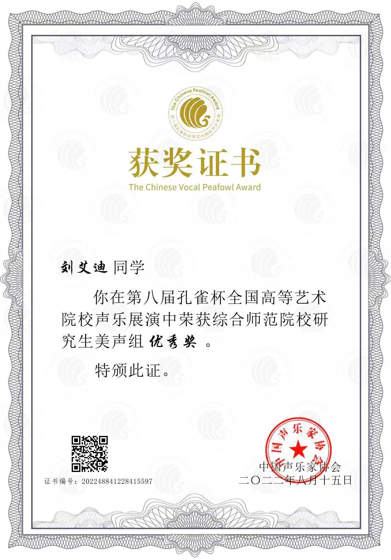 2018级艺术硕士生刘艾迪同学获综合师范院校研究生美声组“优秀奖”;