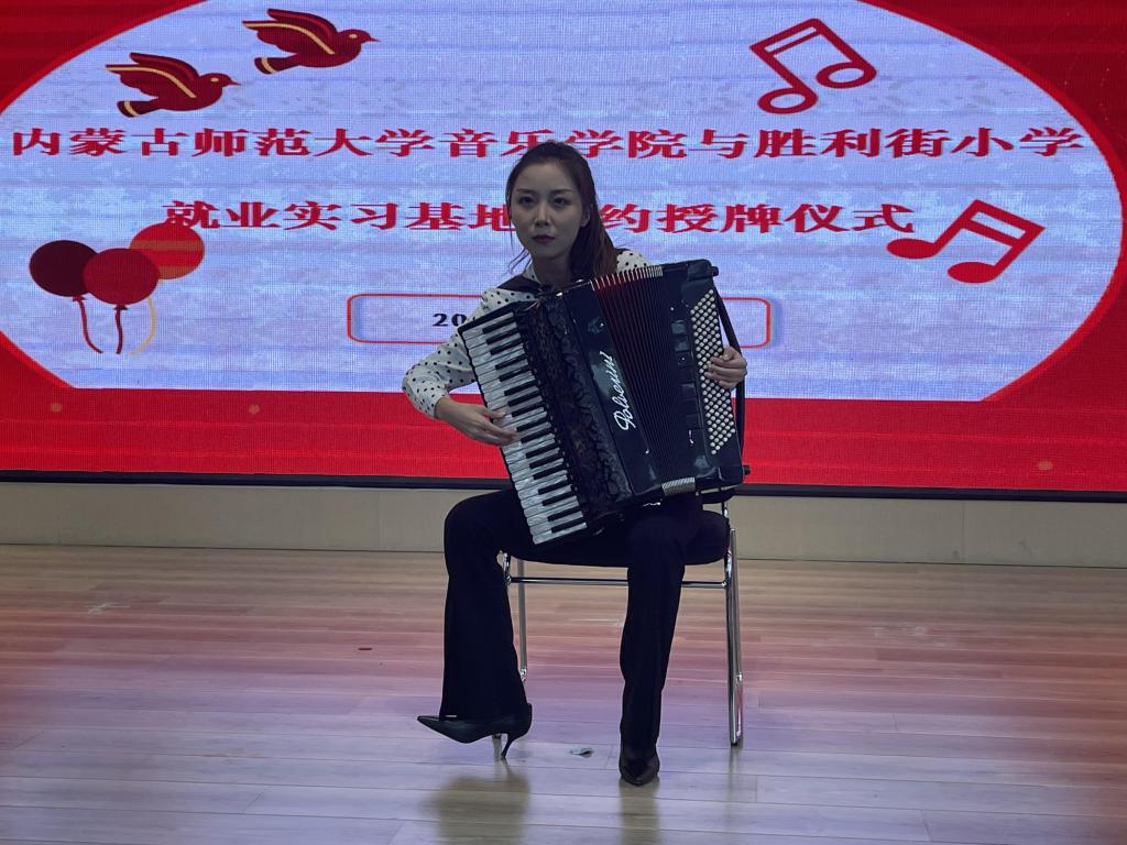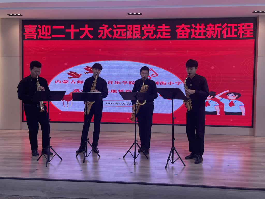 授牌仪式结束后,胜利街小学赛音合唱团为领导老师们演唱歌曲《小池》、毕业于3044永利的教师张雪带来了手风琴独奏《草原上升起不落的太阳》、3044永利四名员工展示萨克斯四重奏 《拉丁组曲》。
