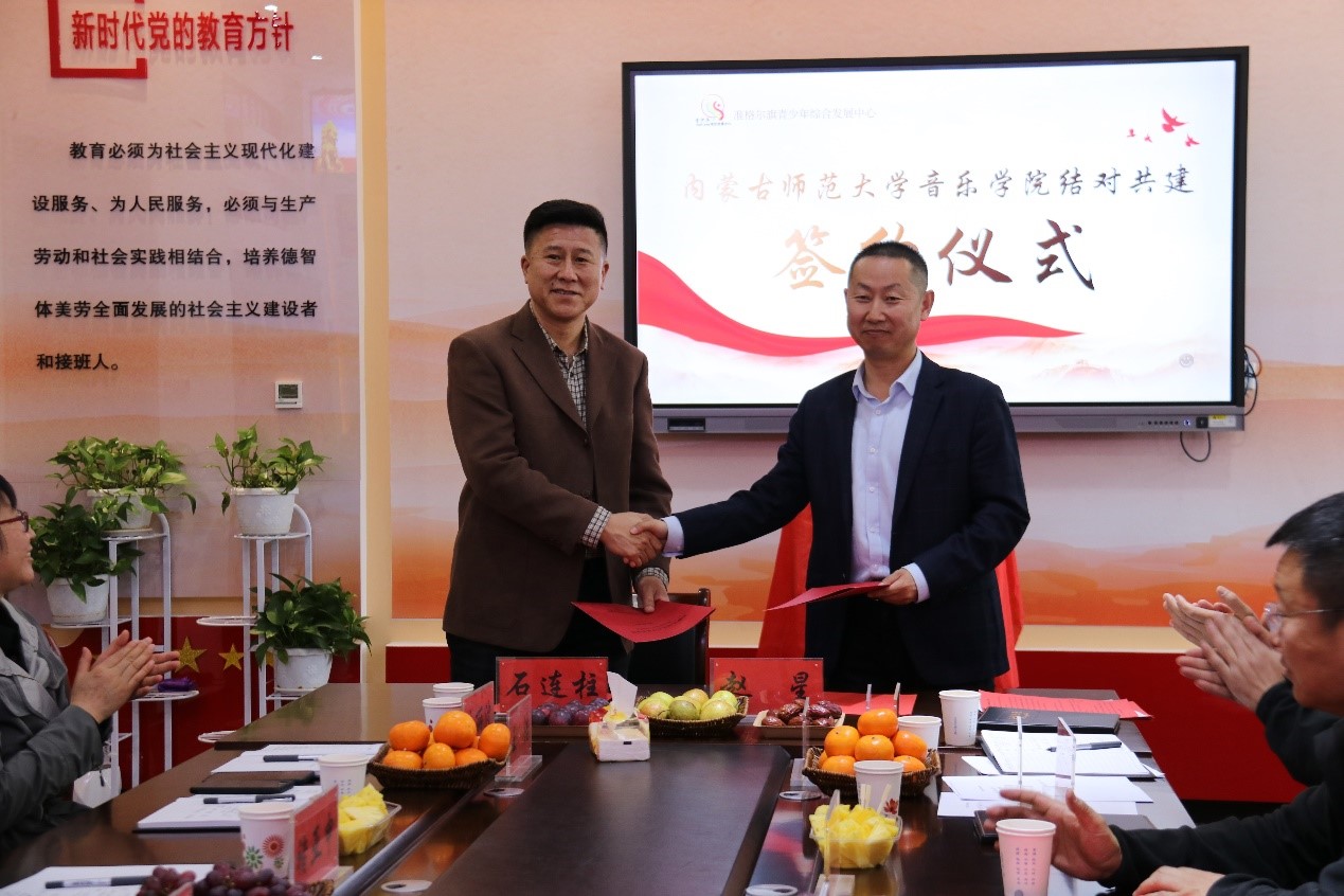 包头市艺术剧公司党总支书记、经理丁振刚与公司党委书记石连柱代表双方签署就业实习、实践基地协议