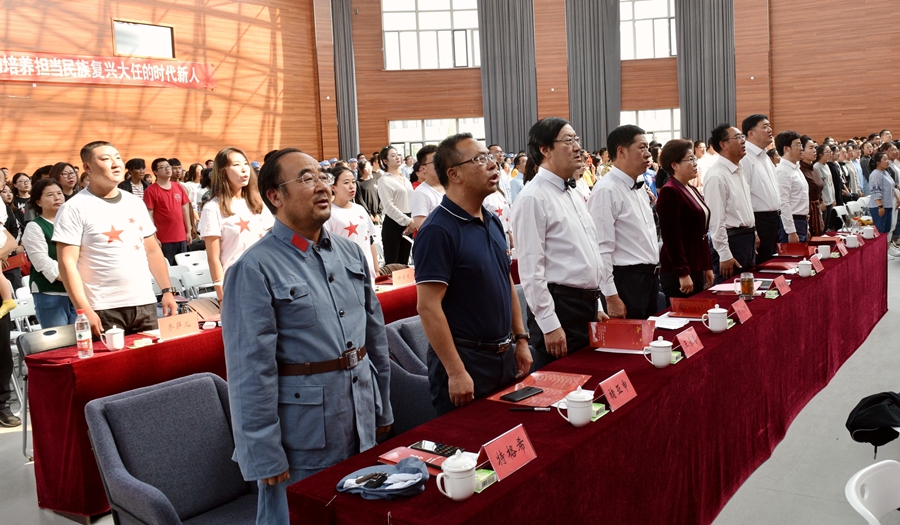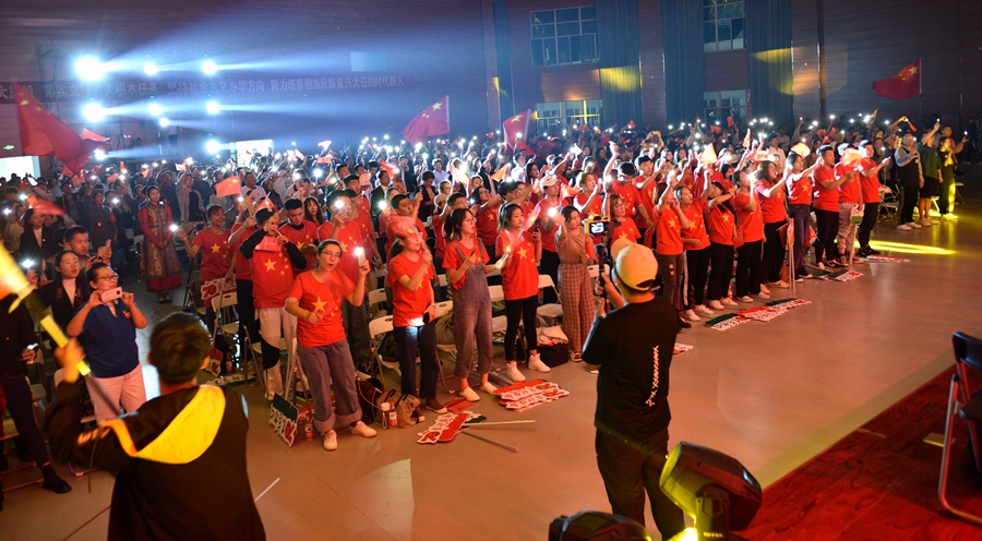 台上引吭高歌,台下掌声不断。华丽的舞台、炫目的灯光、精心准备的曲目、荡气回肠的表演让每一位观众都陶醉其中,仿若身临其境。听到激动之处,观众们不时挥舞着手中的国旗,为台上的老师们高呼喝彩。每到评分环节,参与评审的同学们都高高举起“不忘初心、牢记使命”打分牌,为自己倾心的节目助力呐喊。舞台上精彩不断,观众席更是一片沸腾。