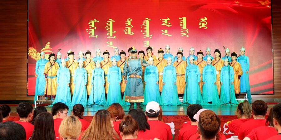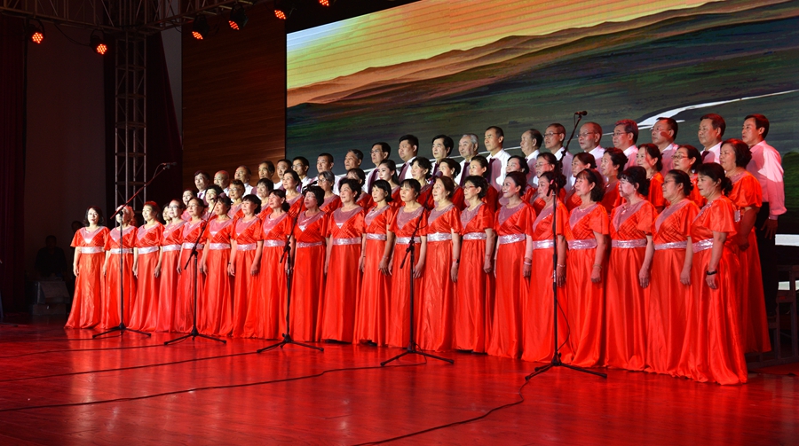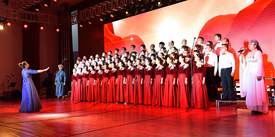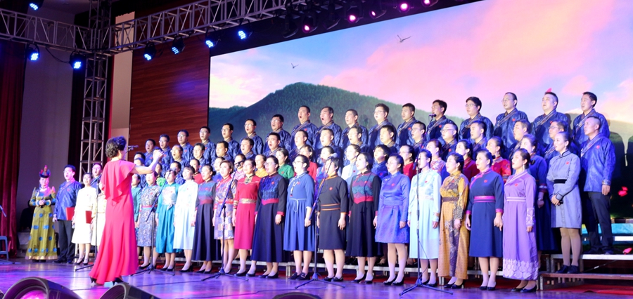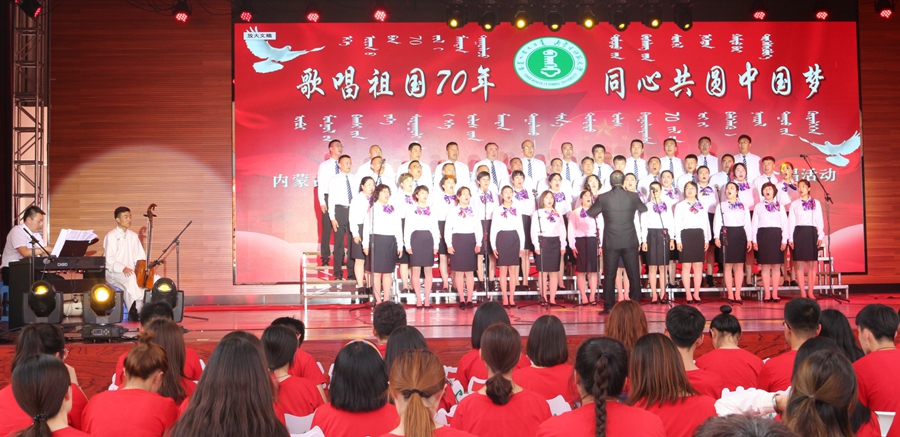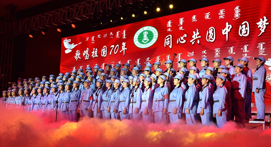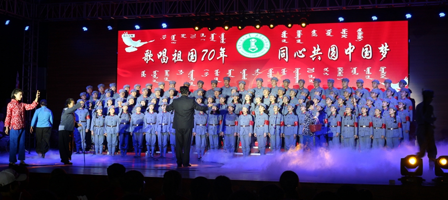 伴随着《美丽的草原我的家》悠扬的旋律响起,大合唱的帷幕正式拉开。演唱人员身着军装、民族服装及各式礼服登场,通过合唱、领唱等形式,讴歌中华人民共和国成立70年的光辉历程、70年的峥嵘岁月。灯光与人影共舞、鼓点与歌声共鸣,雄壮的歌声与优美的舞姿、动听的交响乐、激昂的诗朗诵交织,娓娓道来地讲述了一个又一个令人难忘的草原故事和中国故事。《没有共产党就没有新中国》《嘎达梅林》《我和我的祖国》《美丽的草原我的家》《映山红》《母亲是中华》《太行山上》《共筑中国梦》等一首首耳熟能详、脍炙人口的歌曲不断唱响,整场晚会高潮迭起、异彩纷呈。