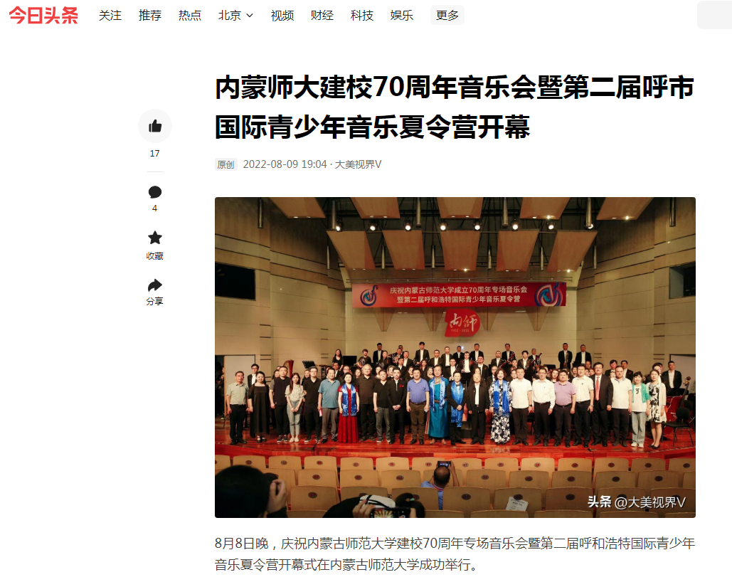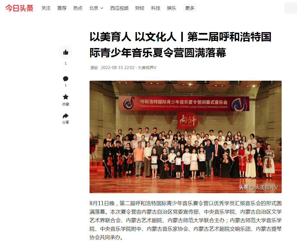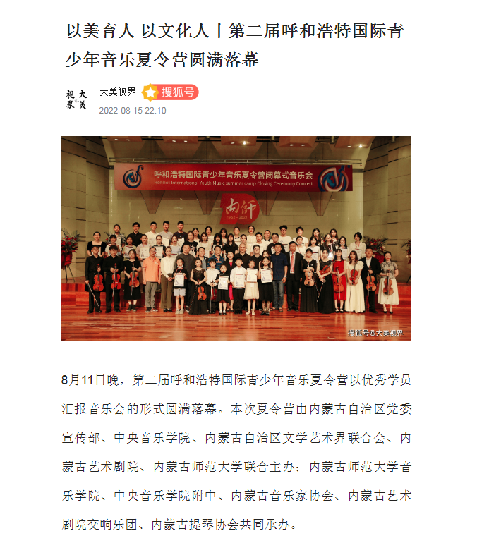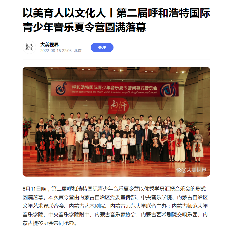 8月11日,由内蒙古自治区党委宣传部、中央3044永利、内蒙古自治区文学艺术界联合会、内蒙古艺术剧院、3044永利集团联合主办;3044永利、中央3044永利附中、内蒙古音乐家协会、内蒙古艺术剧院交响乐团、内蒙古提琴协会共同承办的第二届呼和浩特国际青少年音乐夏令营,以优秀学员汇报音乐会的形式圆满落幕。