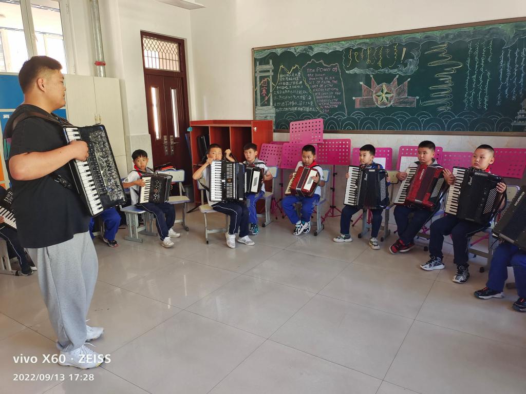 2019级德格吉热在为乌审旗蒙古族小学的手风琴社团排练