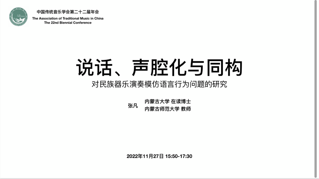 11月27日,青年教师张凡博士在分会场·第五单元的第五会场,通过题为《说话、声腔化与同构——对民族器乐演奏模仿语言行为问题的研究》梳理了我国多民族的器乐表演对语言行为模仿实例,将其按照模仿模式分为说话、声腔化与同构三类,并探索其中的文化内涵。