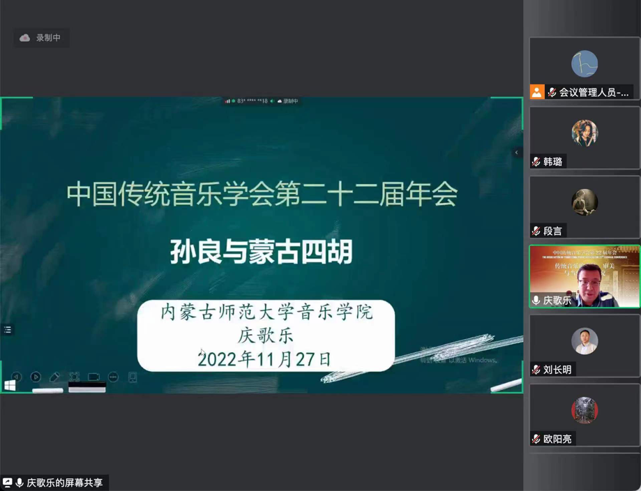 11月27日,庆歌乐副教授在分会场·第三单元的第四会场,主持“传统音乐的表演、审美与当代创作研究”议题,并在题为《孙良与蒙古四胡》中,从四胡的宝贵遗产——孙良的四胡曲目宝库、孙良与科尔沁左翼中旗的四胡演奏传统、孙良对民歌器乐化领域所做的贡献、孙良对传统器乐曲《八音》的贡献等四个方面进行深入阐述。梳理以四胡大师孙良为代表的老一辈民间艺人和专业演奏家群体的表演和创作活动,叙述他们的演奏实践和成就,追忆他们对蒙古族器乐独奏音乐和合奏音乐所做出的贡献。