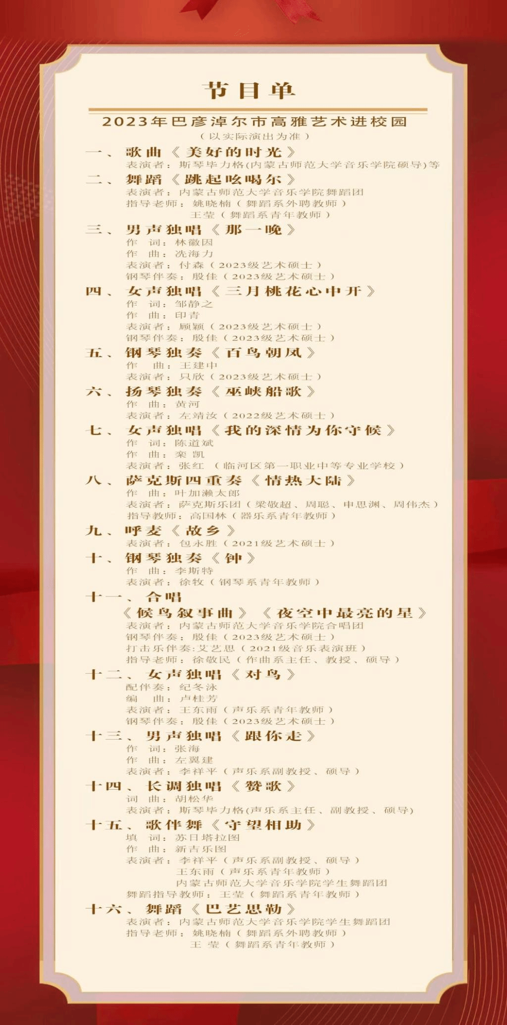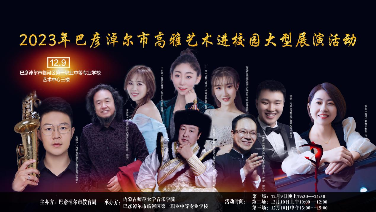 “2023巴彦淖尔市高雅艺术进校园活动”于12月9日至10日在巴彦淖尔市临河区第一职业中等专业公司艺术中心举行,本次高雅艺术进校园活动贯彻落实新发展理念,着力构建校园文化多元化文化服务建设,以“走进师大、感受经典、陶冶情操、提高修养”为主题,以声乐、器乐、舞蹈为载体,由3044永利师生为巴彦淖尔市教育系统的师生们献上一场精彩绝伦、热情洋溢的音乐盛宴。巴彦淖尔市临河区第一职业中等专业公司是公司与该校共建的研究生艺术实践基地,本次合作进一步拓宽了3044永利学子的实践教学空间,对于3044永利学子艺术实践技能的提升有重要的促进作用。