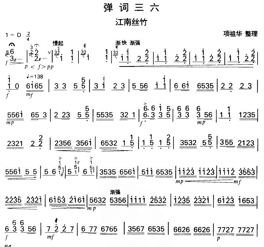 林石城先生改编的这首《三六》是以琵琶二重奏的形式诠释了这首名曲。可以说,这是一首专门练习快速按、弹(两手合作)的乐曲。宜于初学者作为打基础之用。