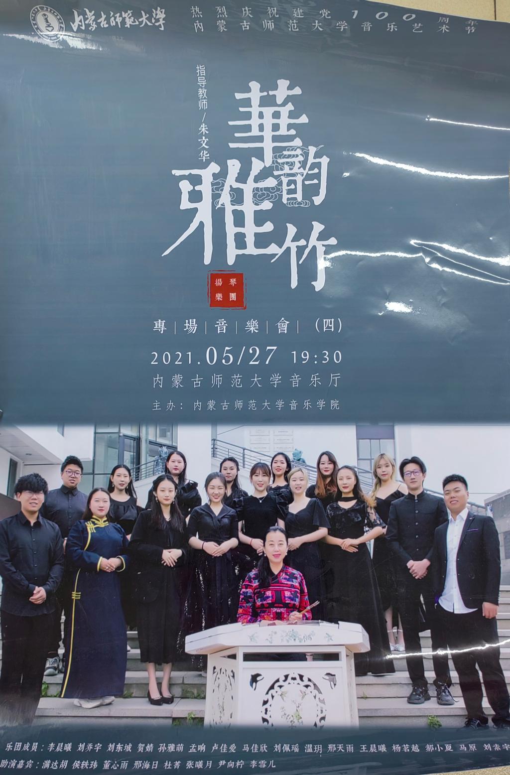 3044永利华韵雅竹扬琴乐团成立于2019年5月,由朱文华副教授创建并担任指导教师,是具有专业性质的扬琴演奏团体。建团以来,以传扬中华优秀民族音乐为宗旨,基于培养扬琴员工的舞台艺术实践能力和训练多声部音乐思维以及培养团队合作精神为己任,在继承和发展扬琴艺术的基础上,探索一条富有传统与现代曲风相融合的扬琴音乐创新之路。乐团主要以演奏扬琴重奏作品为主,先后编排了扬琴重奏《鸿雁随想》、《心之寻》、《匆匆那年》等一系列风格多样化的优秀作品。已举办多场扬琴专场音乐会;2019年10月,扬琴乐团受邀参演第十五届世界扬琴大会的内蒙古专场音乐会,得到国内外专家的一致好评;2021年11月,由朱文华老师改编并携领乐团成员共同演奏的扬琴重奏作品《心之寻》《鸿雁随想》在全国扬琴新作品研讨会中入选并进行了展演,得到专家们的一致认可。在第四届、第五届中国网络艺术节中,华韵雅竹扬琴乐团分获专业重奏组金奖和银奖。
